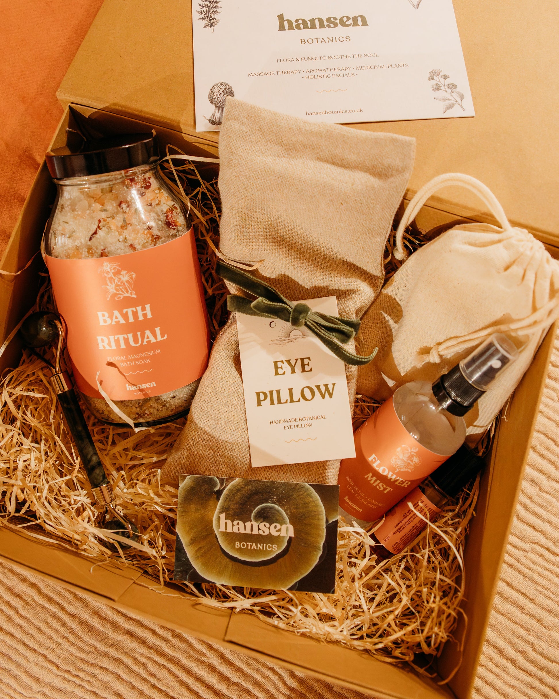 Each gift is presented in a sturdy, high-quality kraft box with a magnetic closure. Boxes are filled with wood wool compostable filler, and finished with moss green velvet ribbon and dried florals, each arrangement unique to your gift.